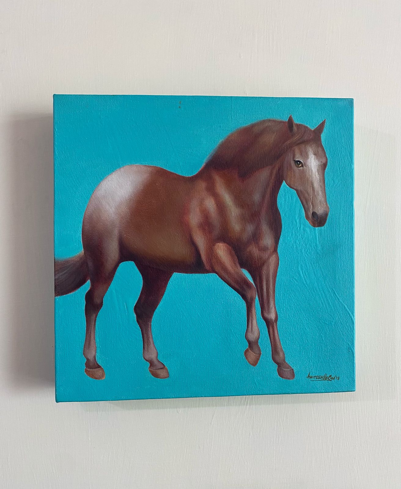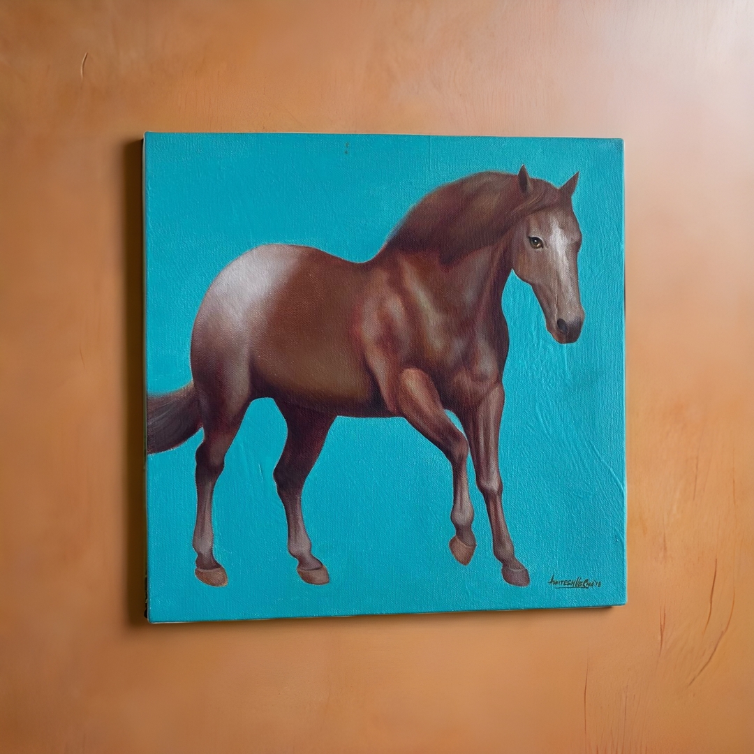 Discover this stunning 12×12 inch oil painting featuring a majestic brown horse against a vibrant turquoise blue background, perfect for elevating your home decor. This original oil painting on canvas captures a powerful brown horse in dynamic motion, with glossy chestnut coat, flowing mane, and expressive eyes. The striking turquoise blue background contrasts beautifully, evoking energy and serenity reminiscent of expressionist styles . it’s ideal for modern living spaces, offices, or galleries seeking bold equine art